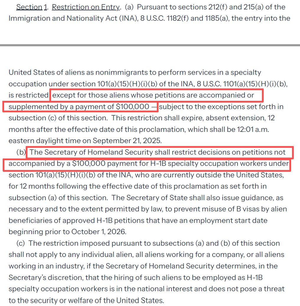 入境限制:自 9 月 21 日起,除非雇主为每个职位缴纳 10 万美元费用,否则申请人不得入境。该措施为期 12 个月,并将在执行 30 天后进行审查,视情况决定是否延长。