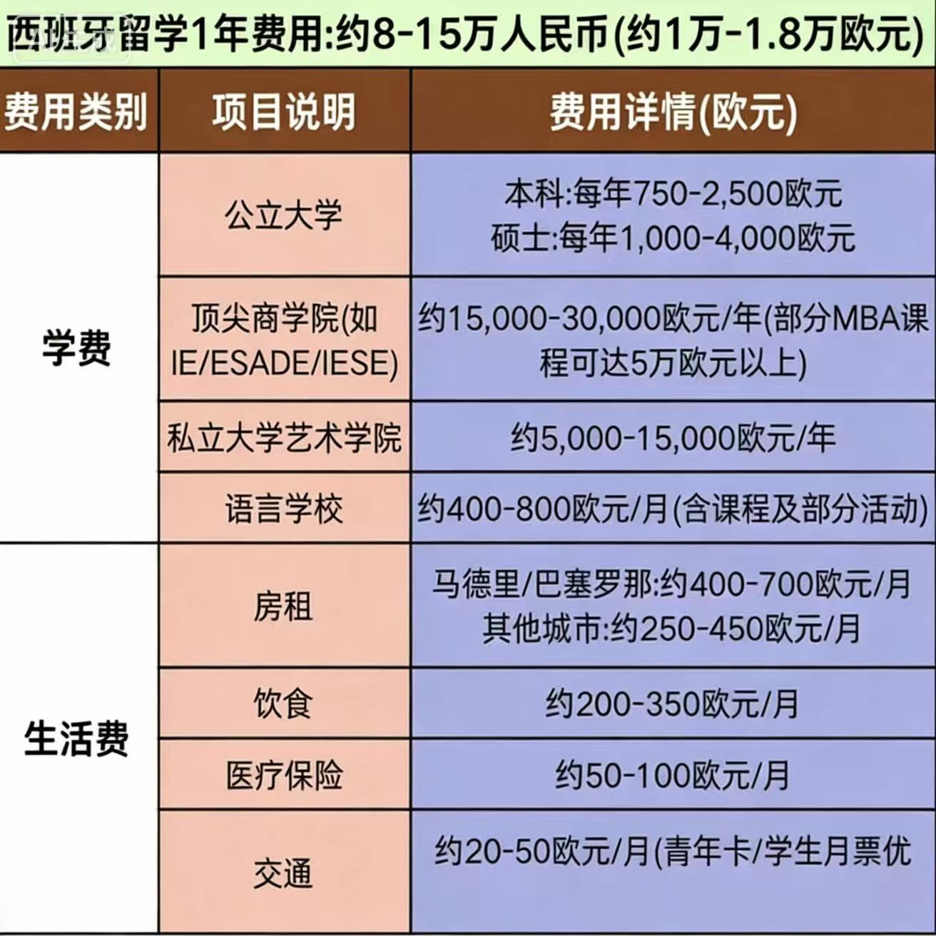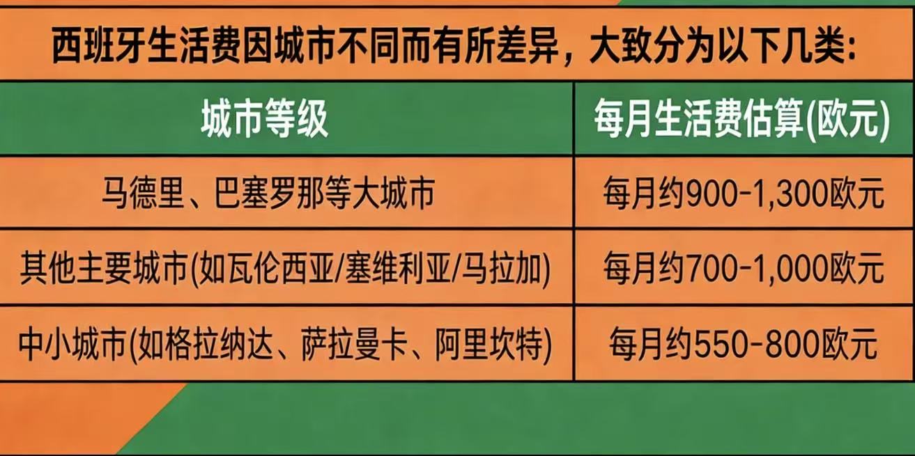 马德里、巴塞罗那等一线城市,月生活费约6000-9000元