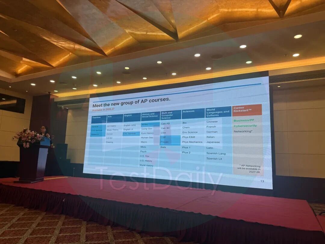 近日, 大学理事会诚邀全国AP学校校长、教学负责人及核心管理层出席“2026大学理事会特别见面会”,分享最新AP/SAT数据动态、AP课程变化与录取偏好。TestDaily的老师也受邀参加本会,为大家带来2025年的最新统计数据与一线名校的录取案例,提供切实的留学规划建议。美国大学理事会最新报告显示,2025年,中国大陆学生在AP和SAT考试中继续展现出强劲的学术实力与参与热度。数据显示,AP报考人数与科目数量持续攀升, 超过35,000名中国学生参加了超过10万次AP考试,考试次数同比增长11%,考生人数增长8%。若将时间线拉长,过去五年间,中国学生参加的AP考试次数累计增长高达88%,考生人数增长63%,这清晰地表明了中国学生对于通过AP课程证明自身学术竞争力的需求在持续、高速增长。中国学生不仅参与度高,更取得了亮眼的成绩:2025年,多达80%的AP考试获得了合格及以上的分数,尤其在STEM和经济学课程中表现突出,这为他们未来的大学学习奠定了坚实基础。此外,AP和SAT成绩作为全球通用学术凭证的价值进一步凸显, 中国学生将SAT成绩发送至全球超过30个国家和地区,将AP成绩发送至25个国家和地区,其中送往亚太地区(如中国香港、新加坡、澳大利亚、日本等地)的成绩单数量显著增加,体现了申请策略的多元化。美国大学理事会(College Board)近年对AP课程体系的调整,清晰地反映了高等教育与未来职业需求接轨的趋势。2026-2027学年,AP课程将增加至8个大类,并新增2门新科目,值得重点关注:AP商业 AP Business with Personal Finance