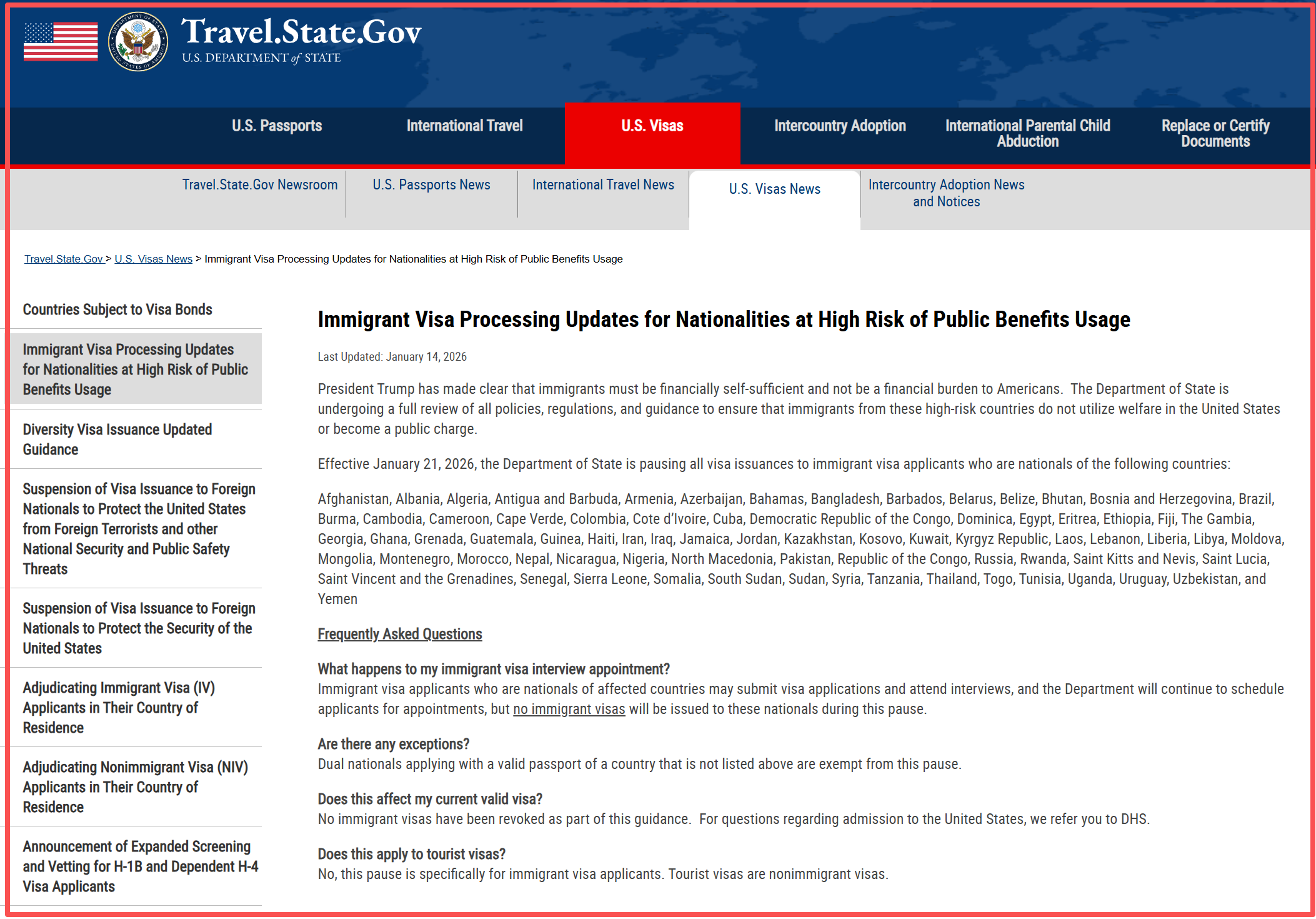 当地时间2026年1月14日,美国国务院正式宣布,将从2026年1月21日起,无限期暂停针对75个国家的“移民签证(Immigrant Visas)”办理。