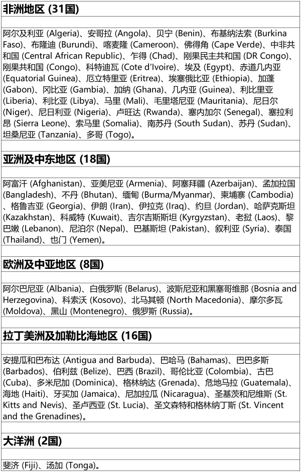 阿富汗、阿尔巴尼亚、阿尔及利亚、安提瓜和巴布达、亚美尼亚、阿塞拜疆、巴哈马、孟加拉国、巴巴多斯、白俄罗斯、伯利兹、不丹、波斯尼亚、巴西、缅甸、柬埔寨、喀麦隆、佛得角、哥伦比亚、科特迪瓦、古巴、刚果民主共和国、多米尼加、埃及、厄立特里亚、埃塞俄比亚、斐济、冈比亚、格鲁吉亚、加纳、格林纳达、危地马拉、几内亚、海地、伊朗、伊拉克、牙买加、约旦、哈萨克斯坦、科索沃、科威特、吉尔吉斯斯坦、老挝、黎巴嫩、利比里亚、利比亚、马其顿、摩尔多瓦、蒙古、黑山、摩洛哥、尼泊尔、尼加拉瓜、尼日利亚、巴基斯坦、刚果共和国、俄罗斯、卢旺达、圣基茨和尼维斯群岛。尼维斯、圣卢西亚、圣文森特和格林纳丁斯、塞内加尔、塞拉利昂、索马里、南苏丹、苏丹、叙利亚、坦桑尼亚、泰国、多哥、突尼斯、乌干达、乌拉圭、乌兹别克斯坦和也门。