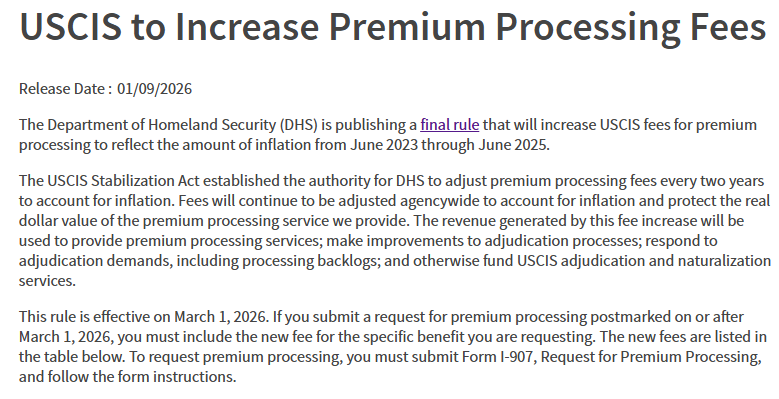 当地时间2026年1月9日据美国移民局官网新闻宣布,美国国土安全部(DHS)已正式公布最终规则,自2026年3月1日起,全面上调各类签证的“加急处理”服务费用,涨幅区间为95至160美元。