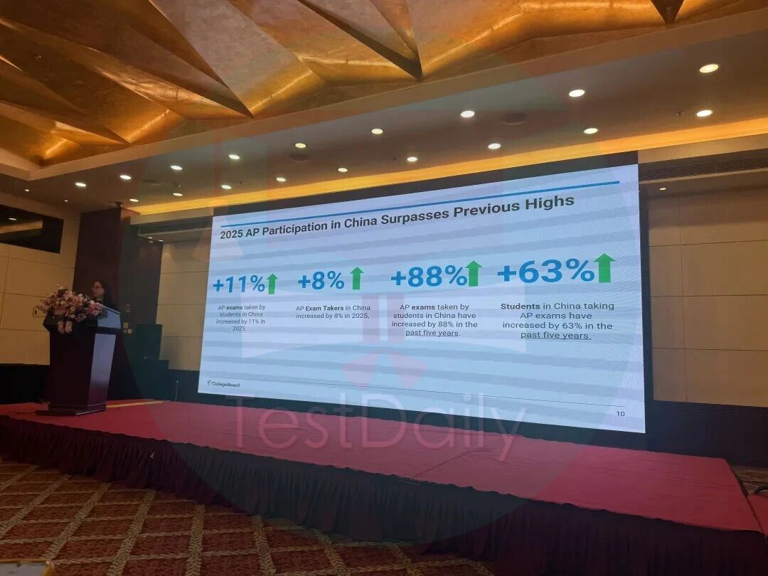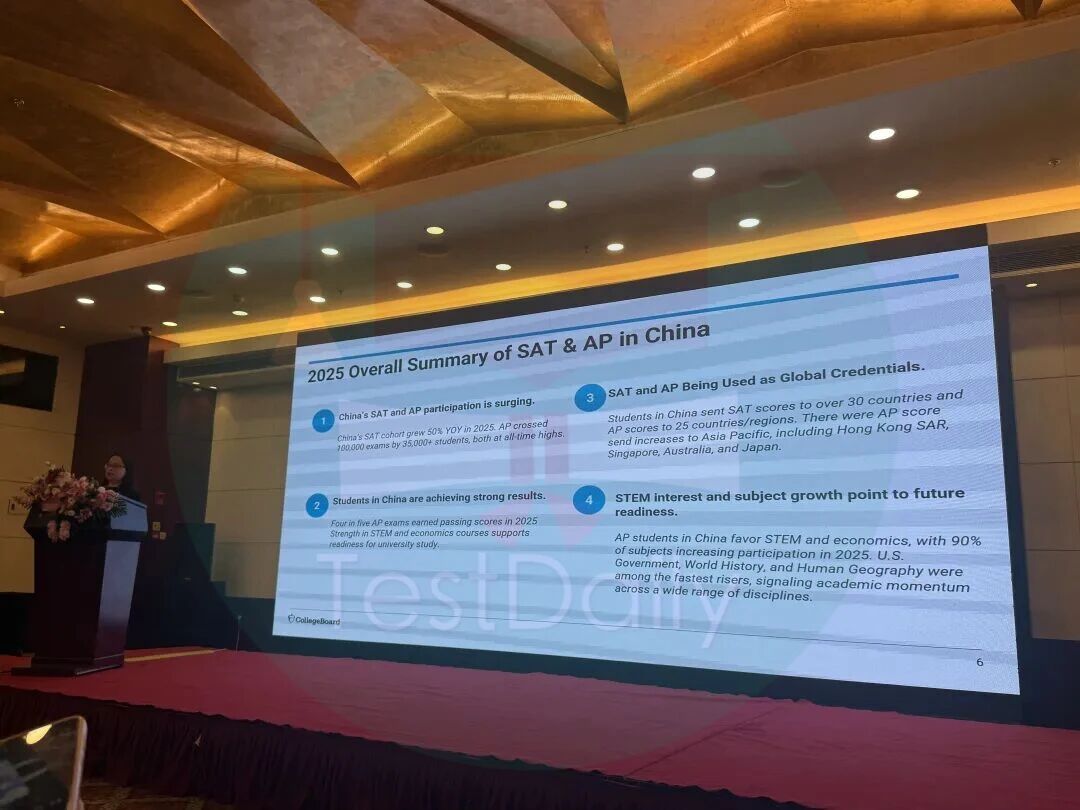 近日, 大学理事会诚邀全国AP学校校长、教学负责人及核心管理层出席“2026大学理事会特别见面会”,分享最新AP/SAT数据动态、AP课程变化与录取偏好。TestDaily的老师也受邀参加本会,为大家带来2025年的最新统计数据与一线名校的录取案例,提供切实的留学规划建议。美国大学理事会最新报告显示,2025年,中国大陆学生在AP和SAT考试中继续展现出强劲的学术实力与参与热度。数据显示,AP报考人数与科目数量持续攀升, 超过35,000名中国学生参加了超过10万次AP考试,考试次数同比增长11%,考生人数增长8%。若将时间线拉长,过去五年间,中国学生参加的AP考试次数累计增长高达88%,考生人数增长63%,这清晰地表明了中国学生对于通过AP课程证明自身学术竞争力的需求在持续、高速增长。中国学生不仅参与度高,更取得了亮眼的成绩:2025年,多达80%的AP考试获得了合格及以上的分数,尤其在STEM和经济学课程中表现突出,这为他们未来的大学学习奠定了坚实基础。此外,AP和SAT成绩作为全球通用学术凭证的价值进一步凸显, 中国学生将SAT成绩发送至全球超过30个国家和地区,将AP成绩发送至25个国家和地区,其中送往亚太地区(如中国香港、新加坡、澳大利亚、日本等地)的成绩单数量显著增加,体现了申请策略的多元化。美国大学理事会(College Board)近年对AP课程体系的调整,清晰地反映了高等教育与未来职业需求接轨的趋势。2026-2027学年,AP课程将增加至8个大类,并新增2门新科目,值得重点关注:AP商业 AP Business with Personal Finance